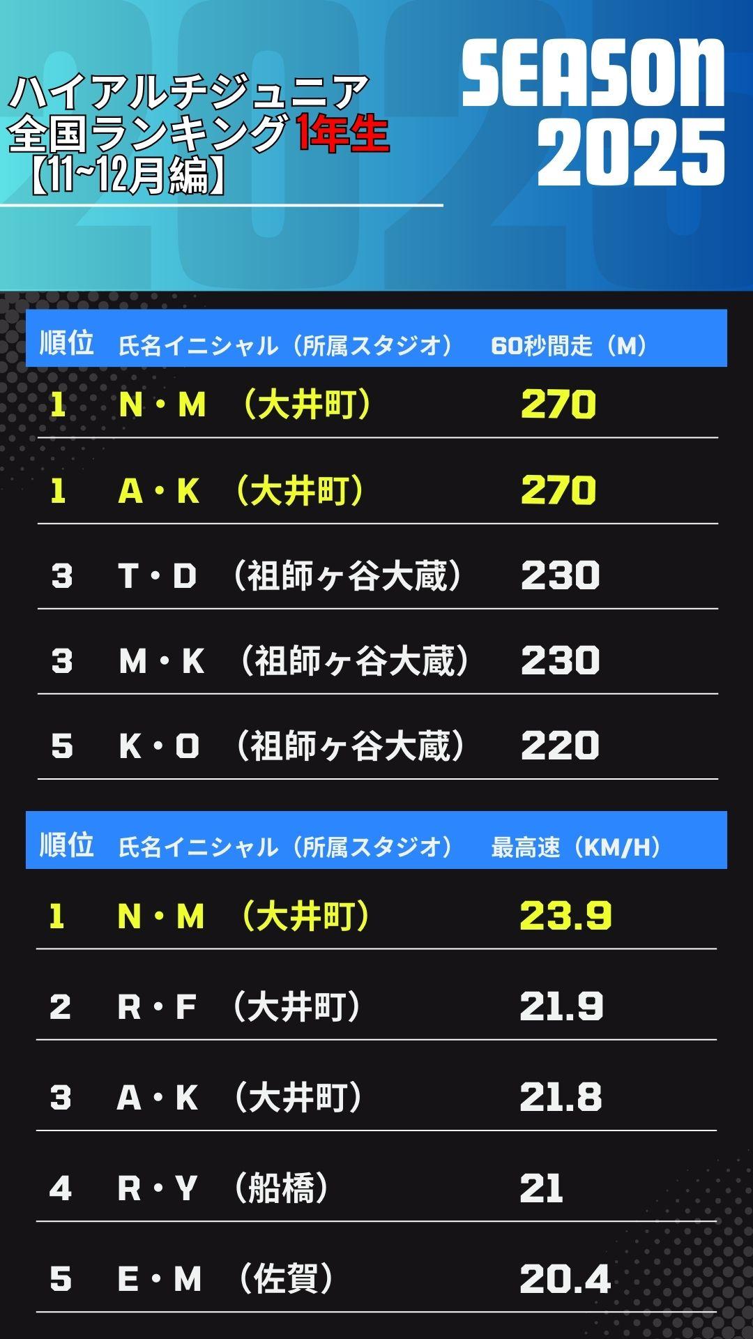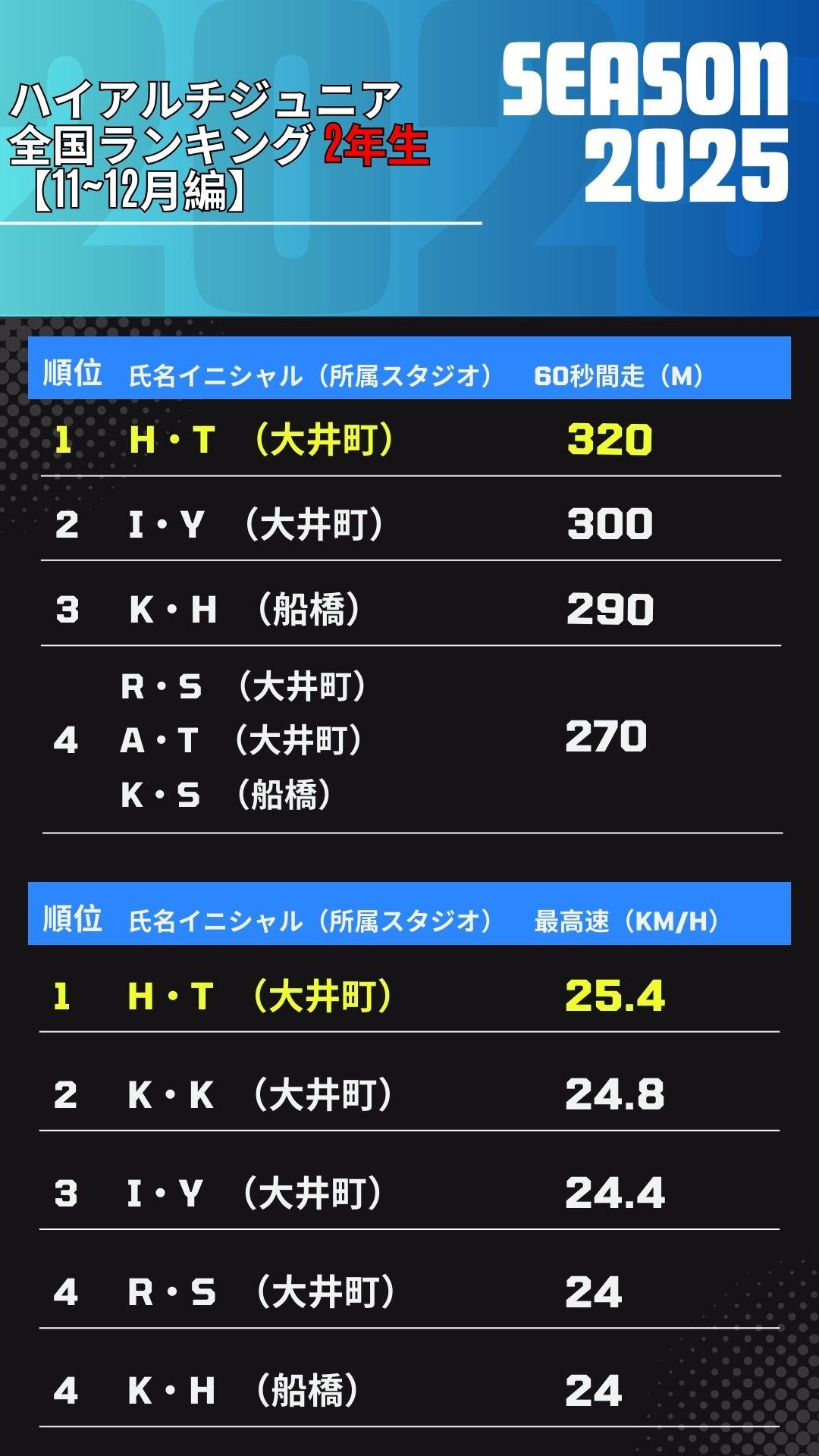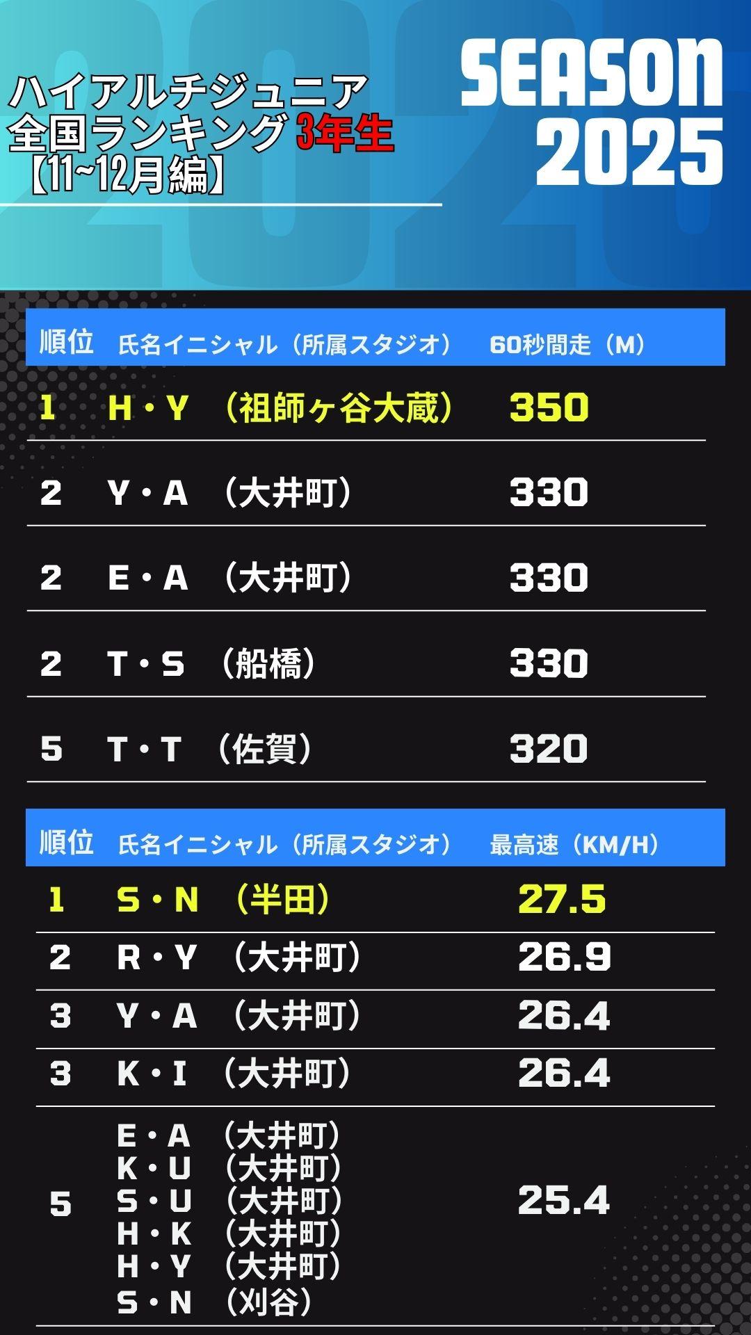 ハイアルチ塾にて2ヶ月に一度実施している『最高速測定』と『60秒間走』の記録を全国各地から集計。